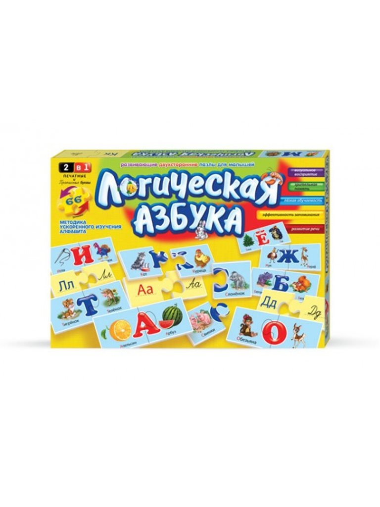 Развивающие пазлы " Логическая азбука" 2620DT Danko Toys. Логическая азбука – это развивающие двухсторонние пазлы для малышей, с помощью которых ребёнок развивает зрительную память, развивает речь, мелкую моторику и одновременно учит алфавит. Возрастная группа от 3 лет.