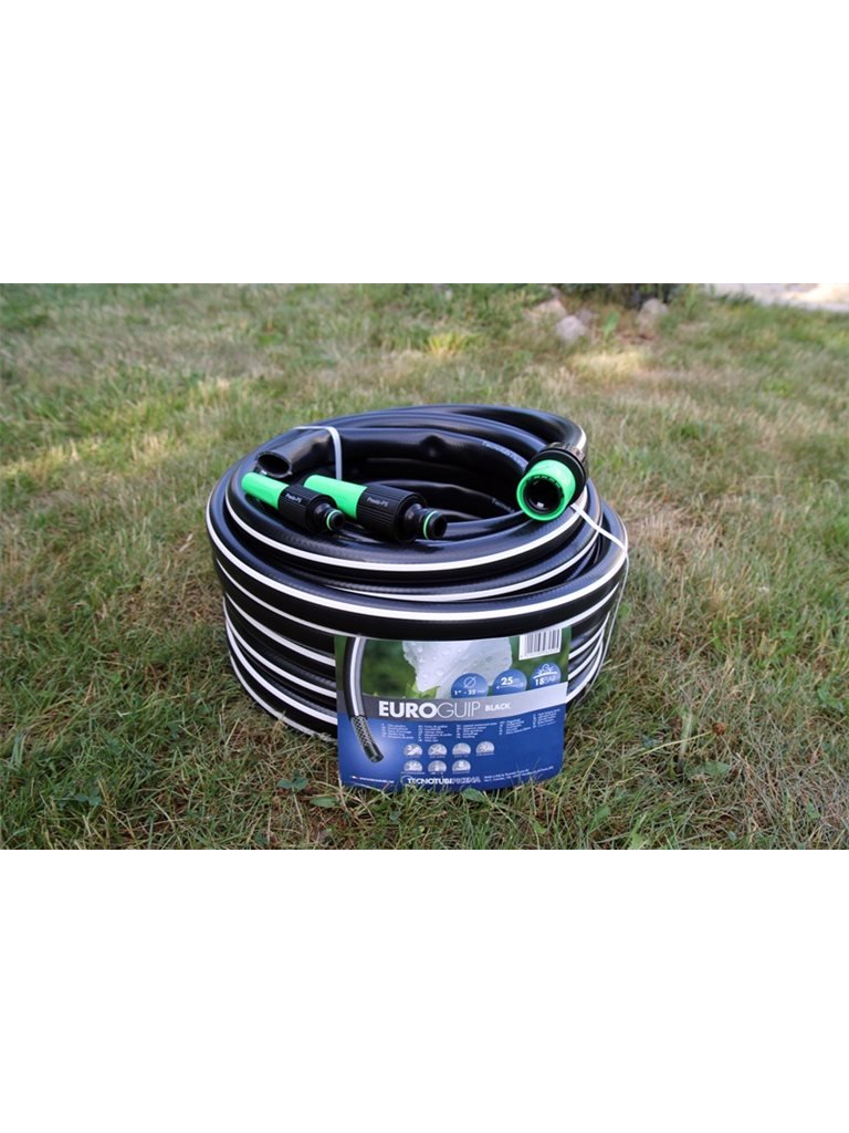 Шланг садовый Tecnotubi Euro Guip Black (EGB 1 25) диаметром 25 мм (1") длиной 25 метров изготовлен из поливинилхлорида высокого качества, устойчив к воздействию воды и водорастворимых удобрений. Плотный наружный слой защищает его от разрушения ультрафиолетовым излучением, истирания и различных механических повреждений. Средний слой шланга - это армирующая оплетка из крепкого синтетического волокна, которая делает его устойчивым к действию высокого давления до 8 атмосфер и стойким на разрыв. Внутренний слой гладкий, практически не создает сопротивления потоку воды, препятствует размножению водорослей и бактерий, не содержит в своем составе вредных примесей.