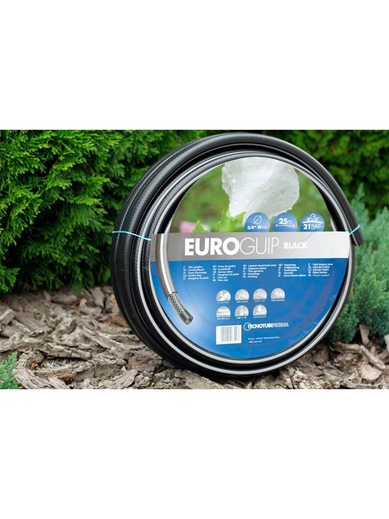 Армированные трехслойные шланги серии Euro Guip Black изготовленные на итальянском заводе Tecnotubi отличаются прочностью, эластичностью и устойчивостью к ультрафиолетовому излучению. Допускают использование в широком диапазоне температур от + 50 до - 5 °C без изменения своих первоначальных технических характеристик. Не содержат в своем составе вредных примесей. Благодаря надежному внутреннему армированию из полиэстеровой нити эти шланги не заламываются и не перегибаются во время полива. Сохраняют свою эластичность и гибкость даже при высоком давлении. Применение в производстве только качественных материалов, современный технологический процесс изготовления и постоянный контроль качества делают возможным использование шлангов этой серии до 8 лет без изменения их физических свойств.