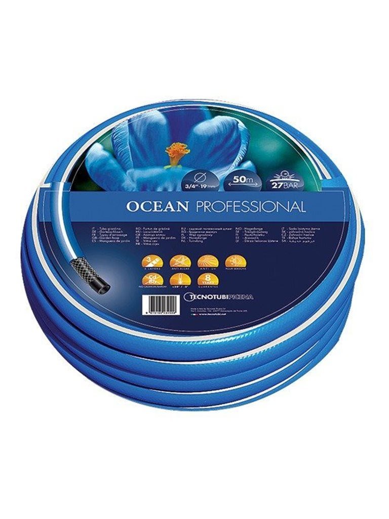 Шланг садовый Tecnotubi Ocean (OC 3/4 50) диаметром 19 мм (3/4") длиной 50 метров изготовлен из высококачественного ПВХ, стойкий к воздействию воды и различных видов удобрений. Плотный наружный слой защищает его от воздействия прямых солнечных лучей, истирания и других механических повреждений. Армирующая оплетка среднего слоя шланга изготовлена из прочного синтетического волокна и делает его стойким к линейным нагрузкам на разрыв и позволяет эксплуатацию при рабочем давлении до 12 атмосфер. Гладкий внутренний слой практически не создает сопротивления потоку воды, препятствует размножению водорослей и бактерий, содержание вредных примесей в составе менее 0,1%.