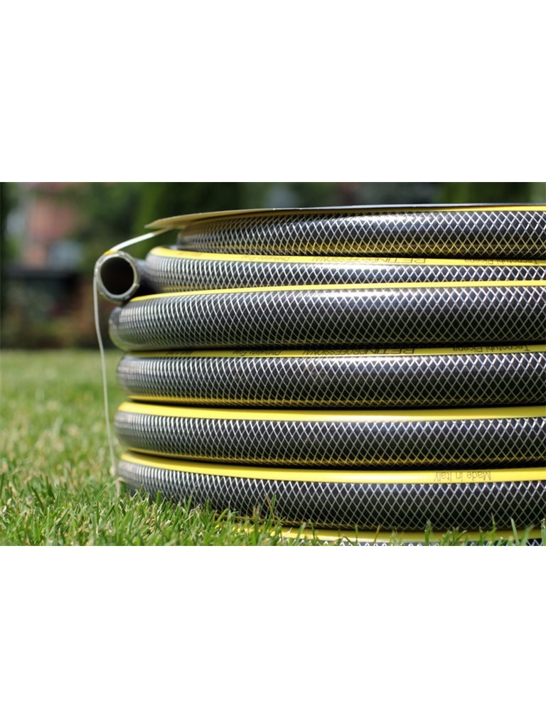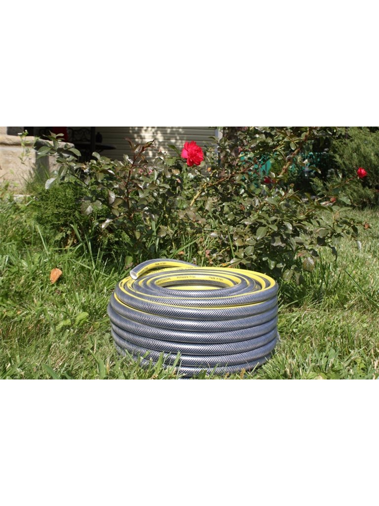 Шланг садовый Tecnotubi Retin Professional (RT 5/8 50) диаметром 16 мм (5/8") длиной 50 метров изготовлен из первичного высококачественного ПВХ, устойчив к воздействию воды, органических и неорганических удобрений. Наружный прозрачный слой предотвращает механический износ шланга и защищает его от воздействия прямых солнечных лучей. Внутренний промежуточный слой армирующей оплетки из прочного полиэстерового волокна делает шланг прочным и эластичным, позволяет сохранять его форму даже при его длительном хранении. Данный шланг имеет хорошие показатели устойчивости к высокому давлению и сопротивлению механическим нагрузкам. Внутренний слой гладкий, без пор, не оказывает сопротивления потоку воды, препятствует росту водорослей и бактерий в процессе эксплуатации.